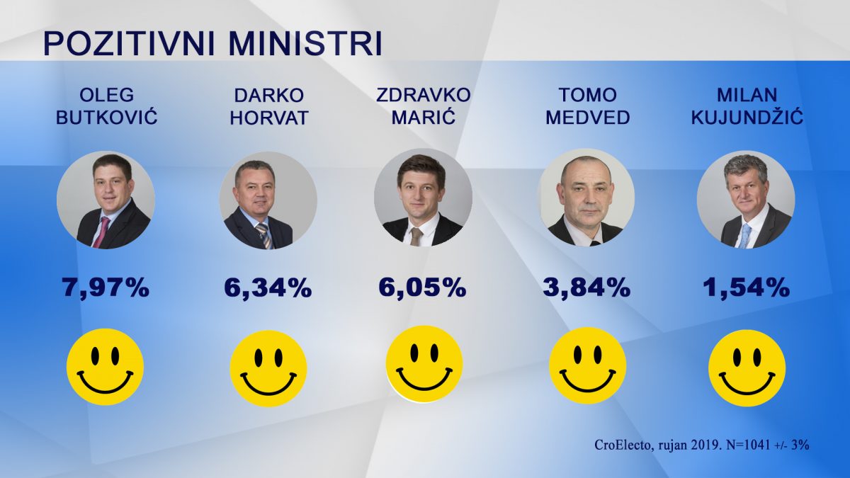 Oleg Butković uvjerljivo je najomiljeniji ministar u Vladi. 7,97% ispitanika smatra ga najpozitivnijim ministrom. Slijede Darko Horvat (6,34%), Zdravko Marić (6,05%), Tomo Medved (3,84%) te Milan Kujundžić (1,54%).