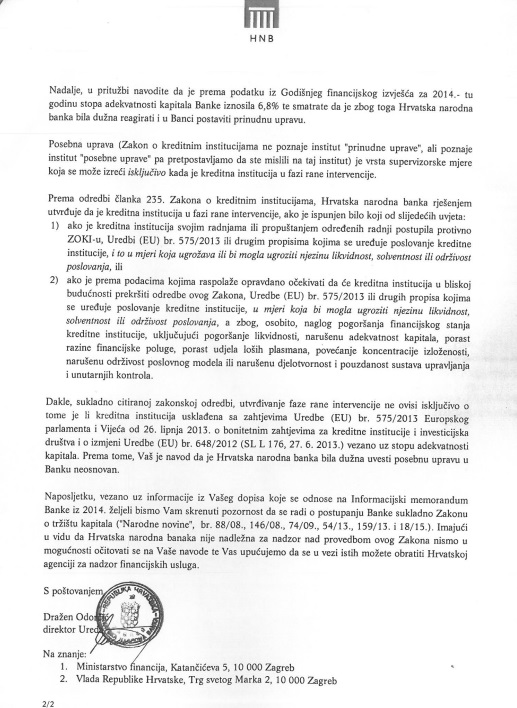 Posebno se postavlja pitanje kako je do takvog pada adekvatnosti kapitala moglo uopće doći imajući u vidu da je Hrvatska Narodna banke sukladno zakonskoj obvezi i svrsi zbog koje postoji dužna intervenirati odmah na temelju provedenih kontrola i nadzora, te kontinuiranog praćenja poslovanja Banke na dnevnoj bazi i kroz mjesečne, tromjesečne, polugodišnje i godišnje izvještaje o poslovanju Banke.