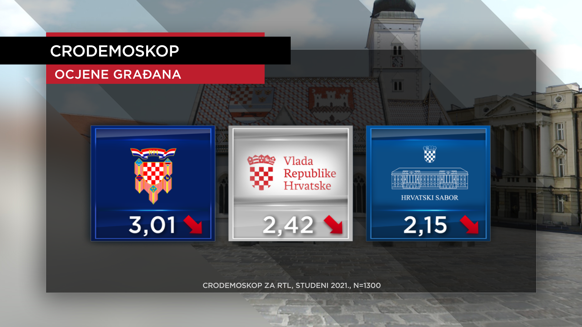 Prošlog su mjeseca sve ocjene rasle, u studenom sve – padaju. Pantovčaku ostaje trojka ali sa slabijim prosjekom (studeni 3,01 – listopad 3,21), Vlada je pala na dovoljan dva (studeni 2,42 – listopad 2,51) baš kao i parlament s tim da je prosječna ocjena Sabora još niža (studeni 2,15 – listopad 2,20).