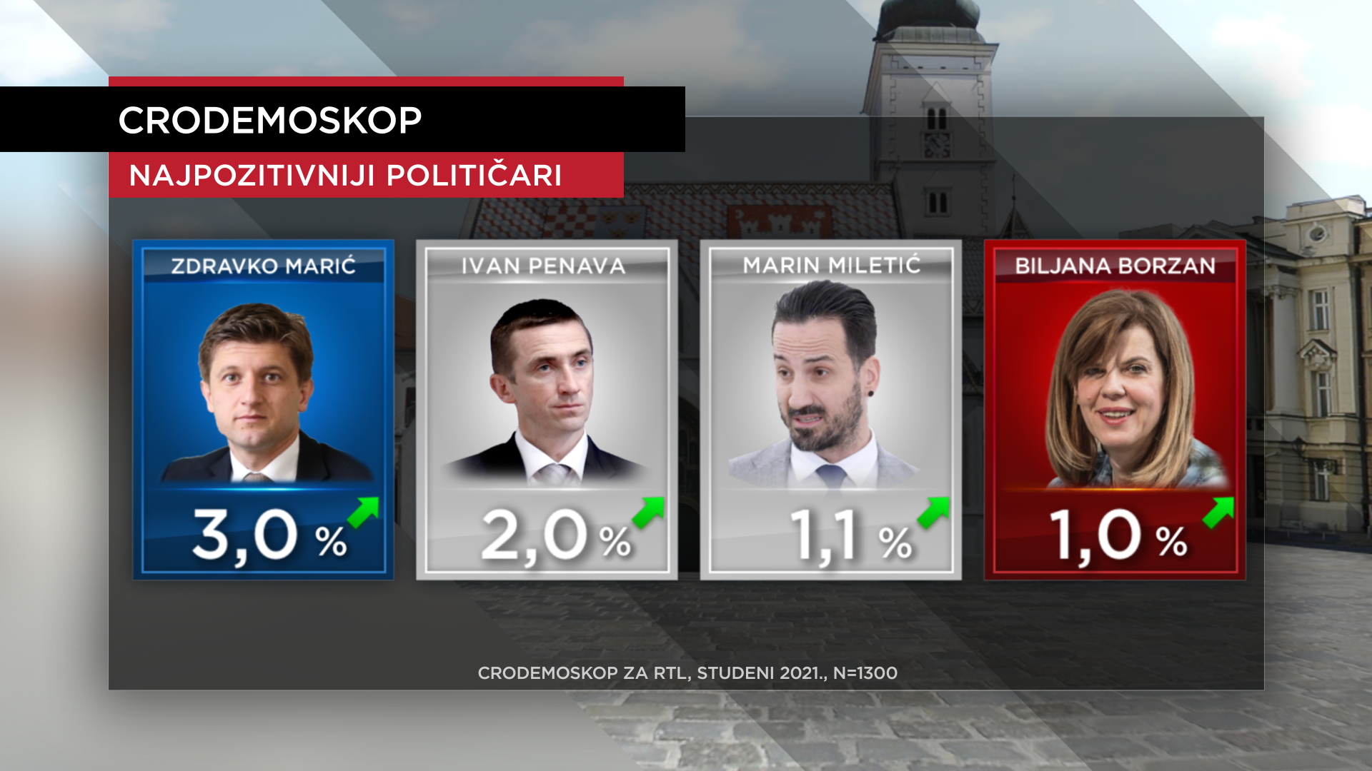 Uz rast rejtinga slijedi ministar financija Zdravko Marić (studeni 3 posto – listopad 2,1 posto), a rast bilježi i novi vođa Domovinskog pokreta i vukovarski gradonačelnik Ivan Penava (studeni 2 posto – listopad 0,7 posto).