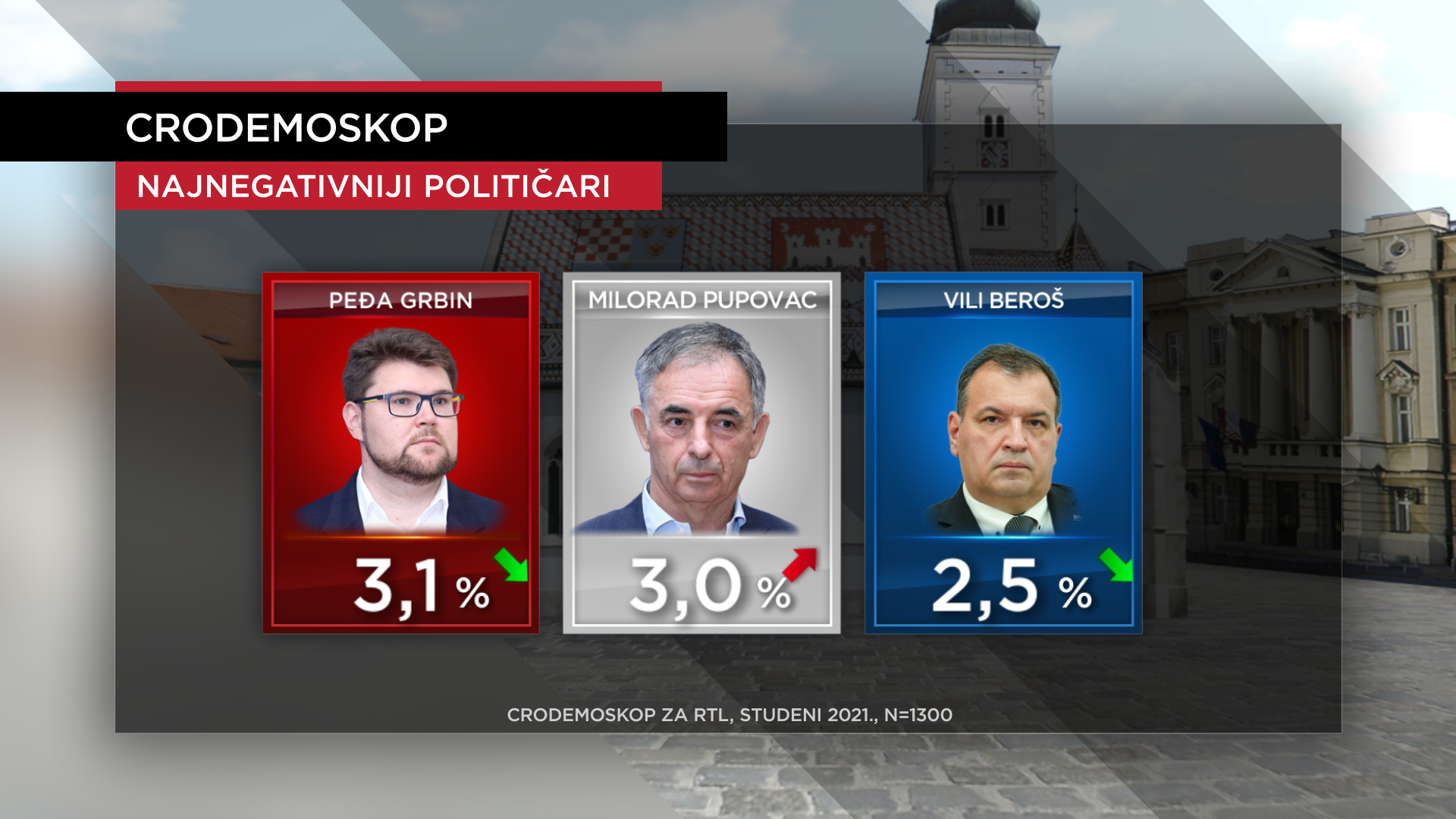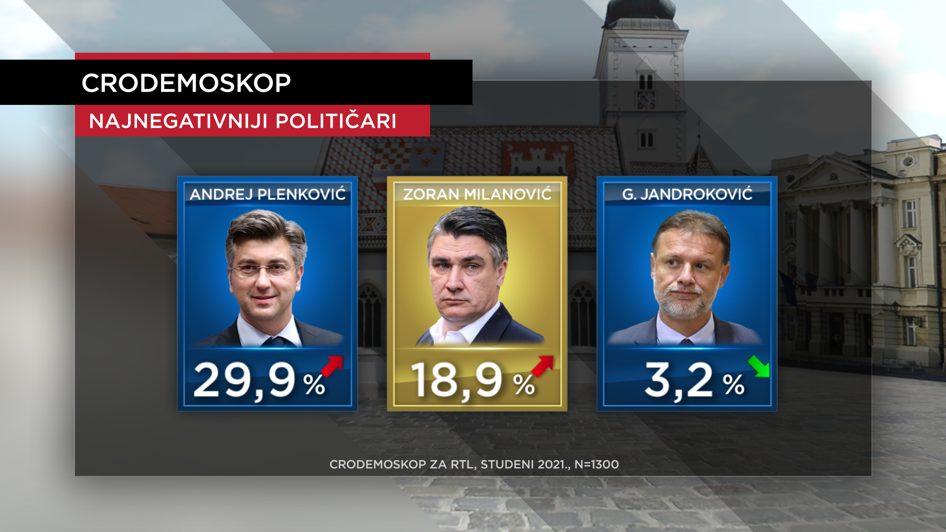Istodobno vodeći dvojac u državi bilježi veliki skok negativnog doživljaja. Prvi najnegativac ostao je premijer Plenković (studeni 29,9 posto – listopad 23,6 posto). S gotovo 30 posto ovo je njegov najlošiji rejting na ovoj ljestvici u proteklih godinu dana. Od prošlog mjeseca predsjednik Milanović povećao je negativni doživljaj za više od 7 postotnih bodova i ostao na drugoj poziciji (studeni 18,9 posto – listopad, 11,9 posto). Na trećoj poziciji je treći predsjednik koji se u sukobe vrha države i nije aktivno uključio pa predsjednika Sabora Gordana Jandrokovića od listopada nešto manje građana negativno ocjenjuje (studeni 3,2 posto – listopad 4,6 posto).