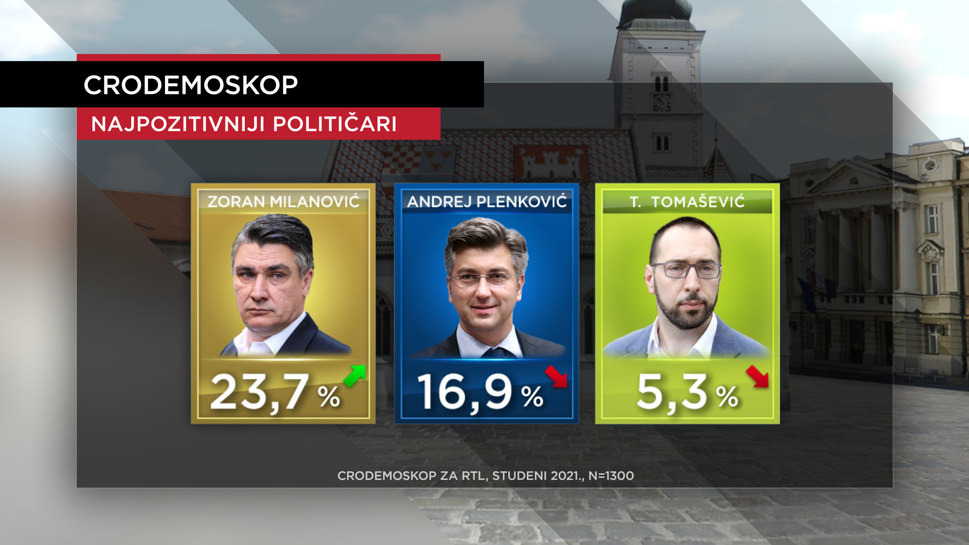 Najodlučnije ove godine ispitanici su za najpozitivnijeg političara odabrali predsjednika Zorana Milanovića (studeni 23,7 posto – listopad 21,9 posto). Nakon teške verbalne paljbe usmjerene prema Vladi četvrtina građana vidi ga u pozitivnom svjetlu. Upravo je premijer, kojeg je predsjednik nazvao hodajućim državnim udavom, ostao drugi izbor. Uz blagi pad rejtinga, Andrej Plenković najpozitivac je za gotovo 17 posto ispitanika (u listopadu bio na 17,5 posto). Rejting je od listopada gotovo prepolovio zagrebački gradonačelnik Tomislav Tomašević iako je zadržao treću poziciju (studeni 5,3 posto – listopad 9,9 posto).