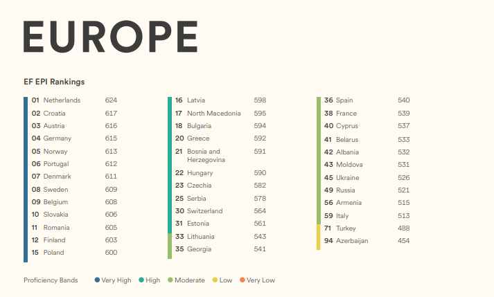 • Turska (488) Azerbajdžan (454) jedine su europske zemlja u kategoriji niskog znanja engleskog jezika prema navedenim podacima. Rezultat ukazuje na ograničenu upotrebu engleskog u svakodnevnom životu i obrazovanju.