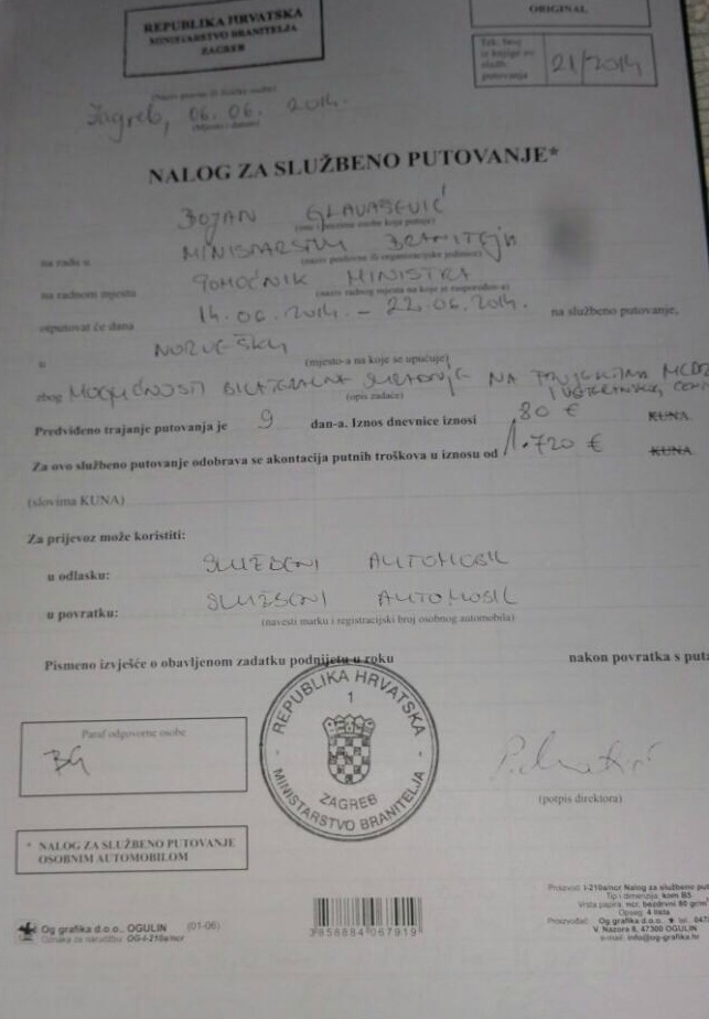 S nabavkom Thule nosača put u Norvešku koštao je porezne obveznike oko 80 000 kuna. Vidljivo je to iz ovog dokumenta.