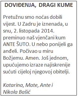 U četvrtak 2. listopada 2014. u svojoj 66. godini života, u zagrljaju svoje hrvatske domovine, zaklopio je svoje oči Ante Šuto, sin Imotske krajine, hrvatski politički emigrant od svoje 16. godine, kad se nakon bijega preko talijanske granice 1965. našao u izbjegličkom koncentracijskom logoru Risiera di San Sabba, koji je nakon Drugoga svjetskog rata služio kao tranzitni logor za tisuće izbjeglica, najviše s područja Hrvatske uklopljene u poslijeratnu Titovu Jugoslaviju.
