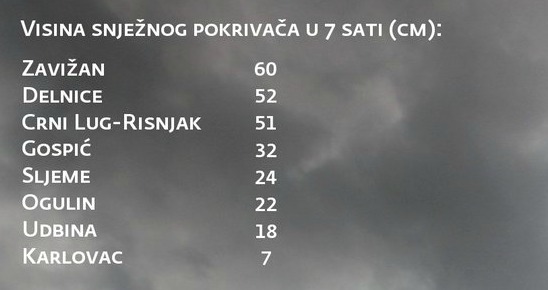 U Hrvatskoj Kostajnici jutros je izmjeren 1 cm snježnog pokrivača, a u Karlovcu 7 cm. U nedalekom Ogulinu čak 22! Očekivano, više je snijega palo u gorskome području. Na postaji Puntijarka jutros su izmjerena 24 cm, u Udbini 18, Gospiću 32, Crnome Lugu 51, Delnicama 52 cm, a na Zavižanu čak 60.