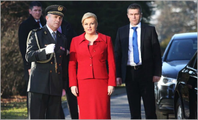 Grabar-Kitarović na Pantovčak je stigla u 9,30 sati te u pratnji pobočnika predsjednika Republike, pukovnika Vlade Čuline izvršila pregled pripadnika bojne u čijem su stroju bile i povijesne odore.
