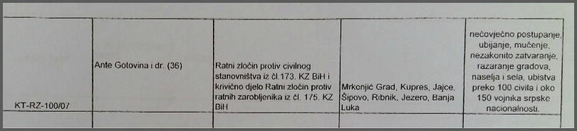 Maxportal je pak u posjedu dokumentacije koja svjedoči da Tužiteljstvo BiH protiv generala Ante Gotovine ( i 36 drugih) vodi predmet pod brojem KT- RZ-100/007. Prijavljen je zbog sumnje u počinjene ratne zločine protiv civilnog stanovništva i zločine protiv ratnih zarobljenika na području Kupresa, Mrkonjić Grada, Jajca, Šipova i Banja Luke.