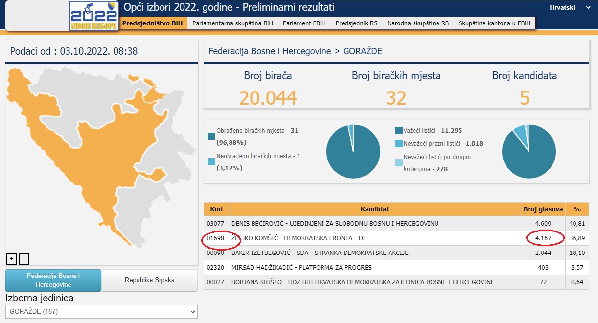 Željko Komšić je u Goraždu dobio 4.167 glasova, a prema popisu iz 2013. u tom gradu živi samo 23 Hrvata Ostalo je prebrojati još nešto više od 3% biračkih mjesta.