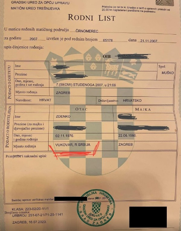 Sporni rodni list izdao je Gradski ured uza opću upravu – Područni ured Trešnjevka 16. srpnja 2020. godine.