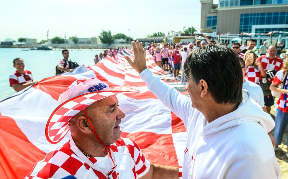 Jutro uoči iznimno važnog dvoboja protiv Kanade, 200-tinjak hrvatskih navijača je ispred hotela naše reprezentacije Hilton Doha razvilo veliku navijačku zastavu. Zbog dužine plaže ovoga puta nije bilo moguće razviti cijelu, 200 metara dugačku zastavu, već samo stotinjak 80 metara koliko je dugačka plaža.