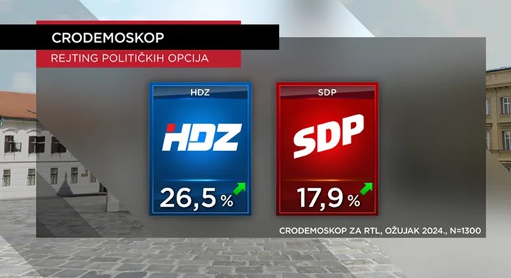 Tako je u mjerenju rejtinga stranaka provedenom između 4. i 6. ožujka HDZ zabilježio izbor od 26.5 posto (25.6 posto prije mjesec dana), što je najbolji rezultat ove stranke u posljednjih godinu dana.