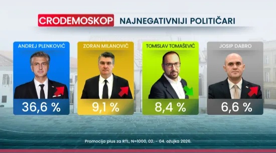 Vrh ljestvice najnegativnijih političara i dalje drži premijer Andrej Plenković, kojeg takvim doživljava 36,6 posto ispitanika, gotovo identično kao i u veljači. Na drugo se mjesto vratio predsjednik Zoran Milanović s 9,1 posto (u veljači 8,1 posto), a treći je Tomislav Tomašević s 8,4 posto, što je značajan pad s prošlomjesečnih 14 posto.