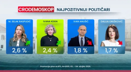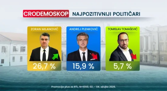 Na ljestvici najpozitivnijih političara na prvom je mjestu predsjednik Zoran Milanović s izborom od 26,7 posto, što je porast u odnosu na 23,6 posto iz veljače. Premijer Andrej Plenković je drugi s 15,9 posto podrške, dok je prošli mjesec imao 17,9 posto. Zagrebački gradonačelnik Tomislav Tomašević treći je izbor s 5,7 posto (u veljači 7,7 posto).