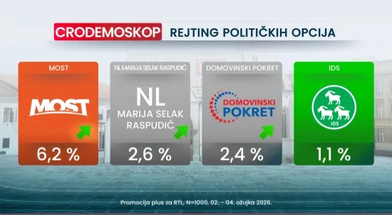 Slijedi Nezavisna lista Marije Selak Raspudić s 2,6 posto (u veljači 2,4 posto), dok Domovinski pokret bilježi 2,4 posto podrške, osjetno više nego u veljači kada su imali 1,6 posto.