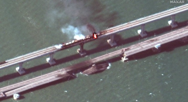 Novinar Christopher Miller na svom Twitteru objavio satelitske snimke oštećenog Krimskog mosta tvrtke Maxar.