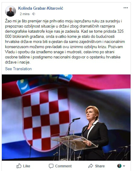Nakon što je premijer Andrej Plenković odbio zahtjev predsjednice Kolinde Grabar-Kitarović da se sazove sjednica Vlade zbog problema demografije, oglasila se i sama predsjednica.