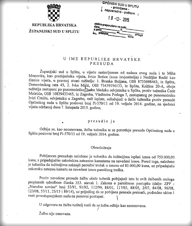 Presuda Županijskog suda u Splitu od 07. listopada 2015. godine