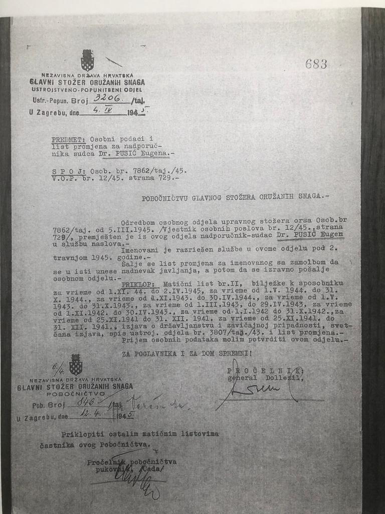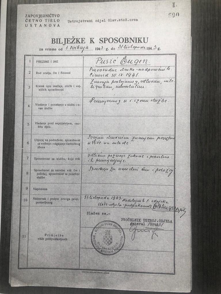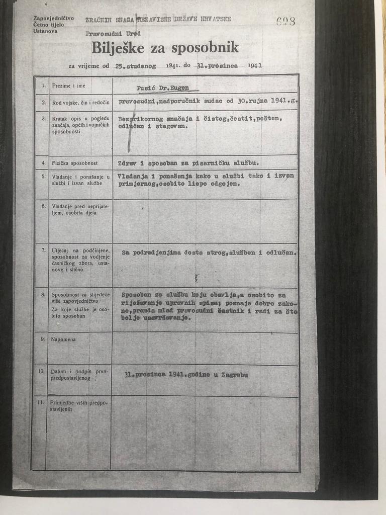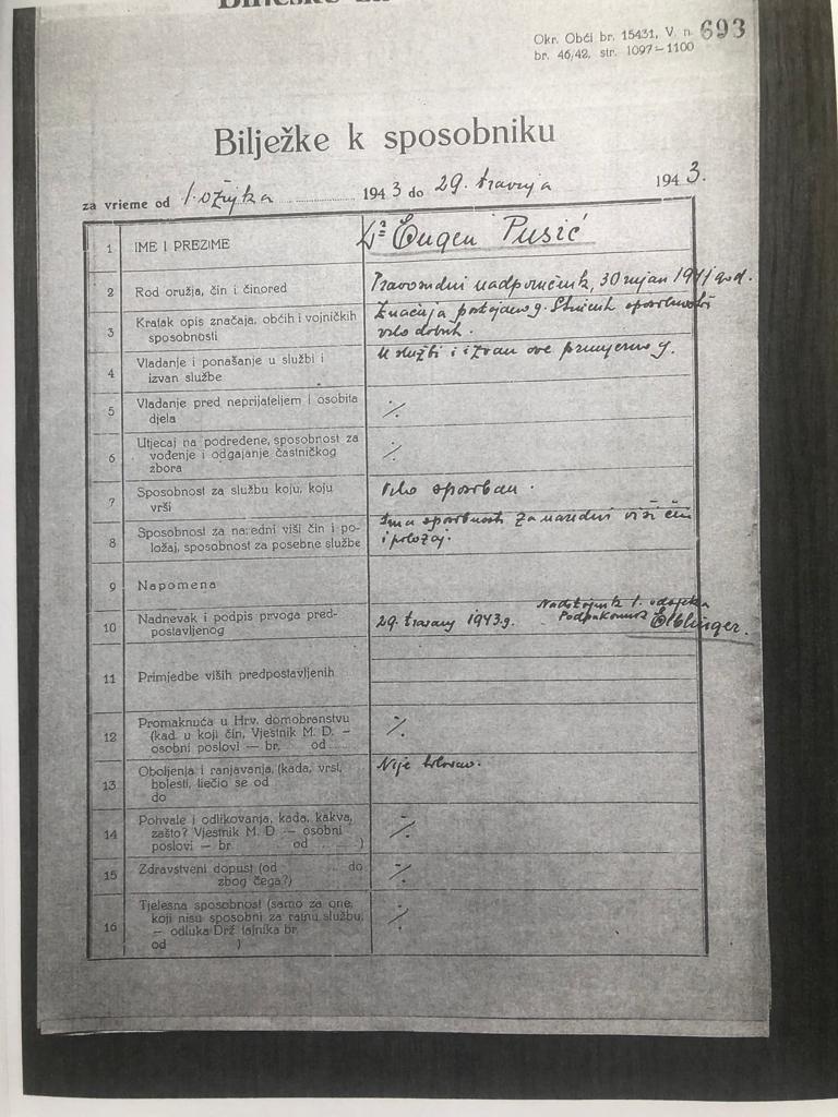U Hrvatskom državnom arhivu, u Fondu Ministarstva oružanih snaga NDH, nalazi se dosje ustaškog natporučnika Eugena Pusića. U Matičnom listu nalazi se Pusićeva fotografija u domobranskoj uniformi. Uz datum i mjesto rođenja piše da je prisegu NDH dao 18. travnja 1941. u Popunidbenom zapovjedništvu u Zagrebu, da je u Hrvatsku kopnenu vojsku stupio 1. svibnja 1941. godine.