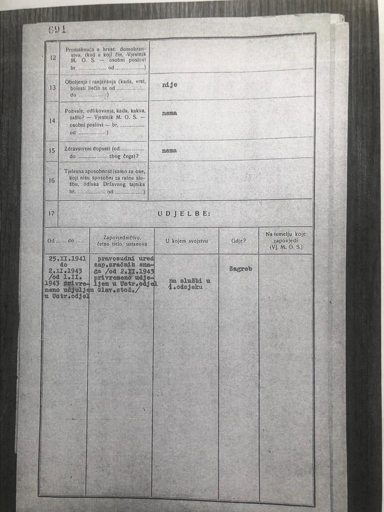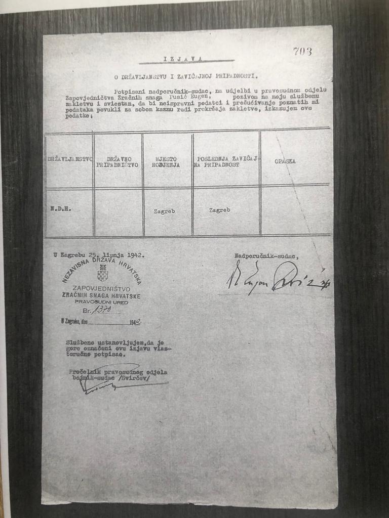 Uz nju se nalazi i “Izjava o državljanstvu i zavičajnoj pripadnosti” u kojoj stoji da je državljanin NDH, da je rođen u Zagrebu te da je posljednje zavičajno mjesto također Zagreb. Tu je izjavu potpisao 26. lipnja 1942. godine.