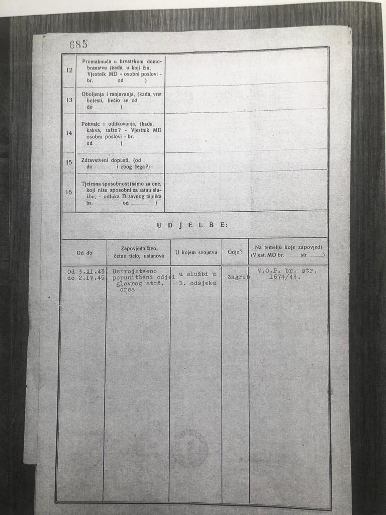 Godine 1944. odlikovan ratnim spomen-znakom “Vrpca” prema naredbi pročelnika Ustrojbenog odjela Ministarstva oružanih snaga (MINORS). Navedena su i njegova promaknuća: od kaplara đaka 1. svibnja 1941. do natporučnika suca 30. rujna 1941. godine. Opći ideološki tečaj polazio je od 20. do 24. ožujka 1944. godine.