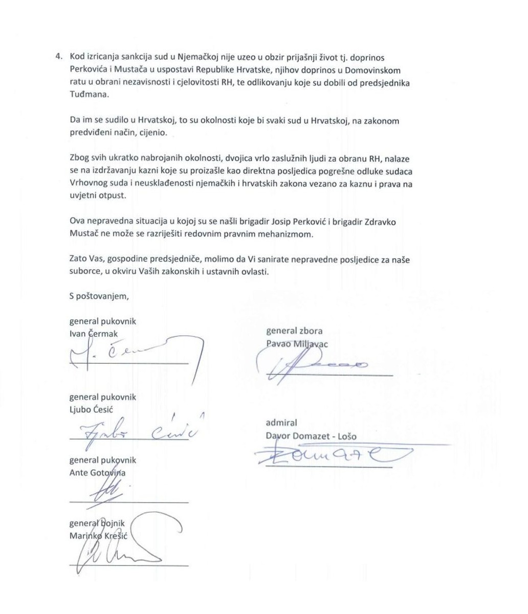 Ova nepravedna situacija u kojoj su se našli brigadir Josip Perković i brigadir Zdravko Mustač ne može se razriješiti redovnim pravnim mehanizmom. Zato vas, gospodine predsjedniče, molimo da vi sanirate nepravedne posljedice za naše suborce, u okviru Vaših zakonskih i ustavnih ovlasti”, navode generali u pismu.