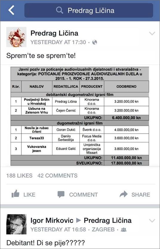 Predrag Peđa Ličina, sin poznatog udbaša Đorđa Ličine i miljenik SDP-a, od Hrvoja Hribara i Hrvatskog audiovizualnog centra za snimanje filma “Posljednji Srbin u Hrvatskoj” dobio je samo par tjedana prije izbora 3 milijuna i 200. 000 kuna!