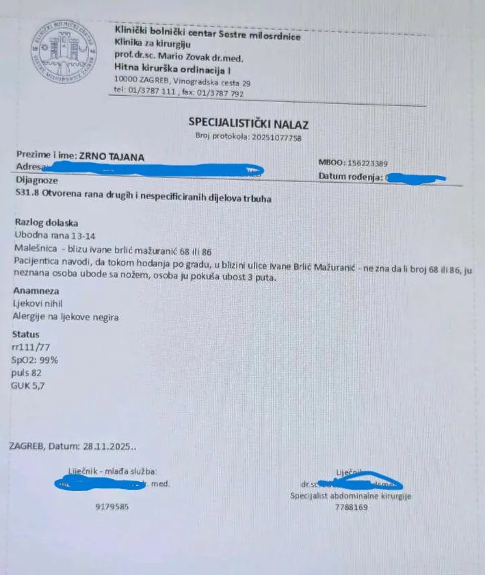 Zagrebačka policija izvijestila je u subotu da je jučer, 28. studenoga, oko 14:45 sati zaprimila dojavu iz Kliničke bolnice Sestre milosrdnice o ženskoj osobi koja je zadobila ozljedu oštrim predmetom u predjelu abdomena.