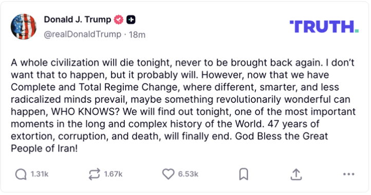 Američki predsjednik Donald Trump oglasio se na svojoj društvenoj mreži Truth Social i uputio jezivu prijetnju Iranu. Izraelska televizijska postaja Kanal 13 u svojim vijestima prikazuje veliki digitalni sat koji odbrojava sate i minute do isteka roka Trumpova ultimatuma.