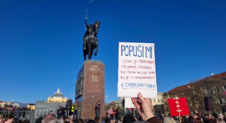 Ispred improvizirane pozornice, postavljene uz spomenik kralja Tomislava, istaknut je veliki transparent s porukom “Lutnja, otpor, promjena”.