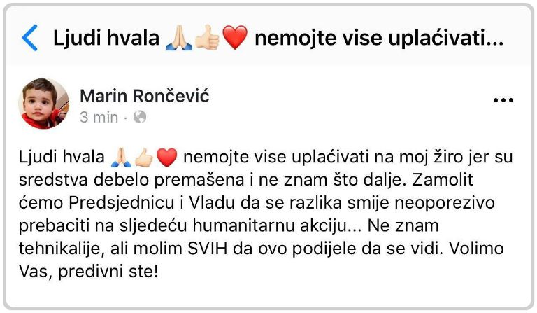 I to nakon što je obavijestio hrvatsku javnost da je prikupljeno i više nego dovoljno novca za liječenje u bolnici u Philadephiji, točnije 26,7 milijuna kuna samo na donacijskom računu Marin Rončević.