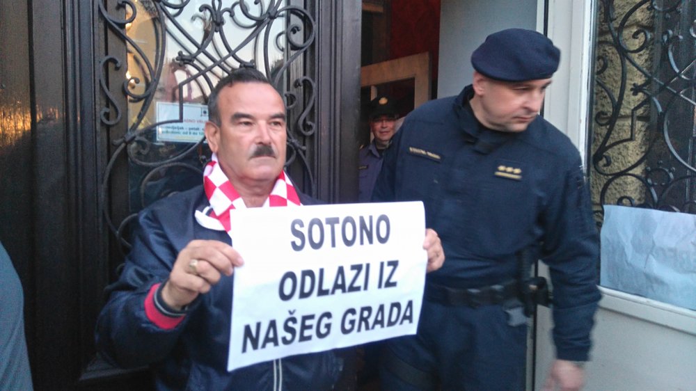 Među njima je Marko Skejo s transparentom “SOTONO, ODLAZI IZ GRADA, a prije ulaska na kulturno uzdizanje pozirali su s tranparentima.