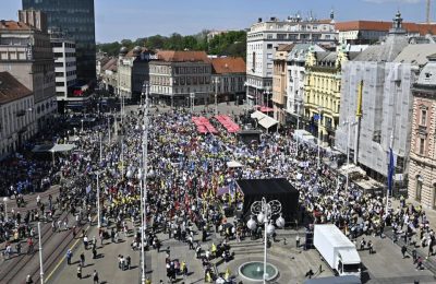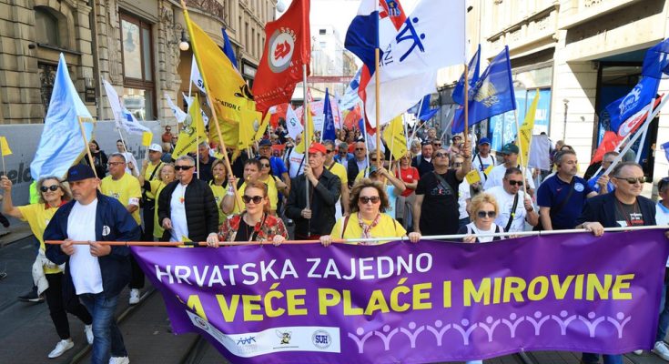 Prosvjed “Hrvatska zajedno za veće plaće i mirovine”, u organizaciji tri sindikalne središnjice SSSH, NHS i MHS te Sindikata umirovljenika Hrvatske (SUH), okupio je u subotu na glavnom zagrebačkom trgu više tisuća građana, studenata, radnika, umirovljenika i članova sindikata.