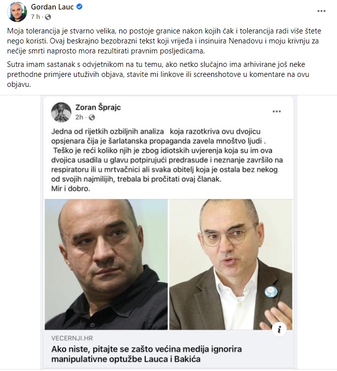 Lauc zbog toga sada najavljuje tužbu, a svoje je pratitelje pozvao da mu dostave još linkova ili screenshotova, kako je rekao, utuživih objava.